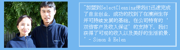 多年来,我们有效且持续地支持着这些生活在澳大利亚和新西兰的SelectCleaning加盟商。现在我们把他们成功的故事与您分享: